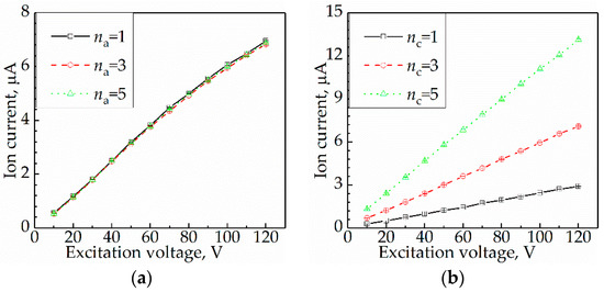 From Figure 5a, the five curves are similar to each other; it means that the regularities of changing with were similar under different . The five horizontal lines reveal that as rose from 1 to 5, grew up, while stayed constant. For instance, as increased from 1 to 5, at = 5 mm, 17 mm, 29 mm, 41 mm, and 53 mm remained unchanged at about 6.03 μA, 7.20 μA, 7.03 μA, 7.00 μA, and 6.91 μA, respectively. This result is consistent with that in Section 3.2.1, which is that the anode area almost has no effect on the ion current.