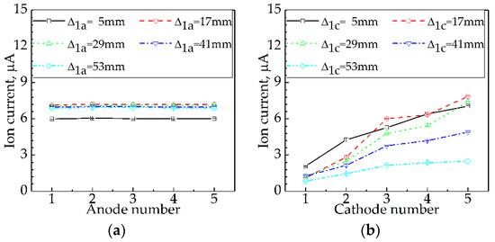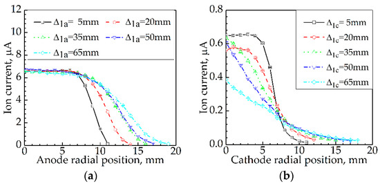 According to the curve shapes, the five curves in Figure 7a can be divided into two groups. Group 1 includes the curves for = 5 mm, 20 mm, and 35 mm, and Group 2 contains the curves for = 50 mm and 65 mm. In each group, the regularities of the ion current changing with the anode radial position are similar to each other.