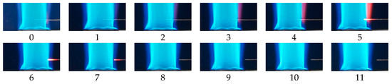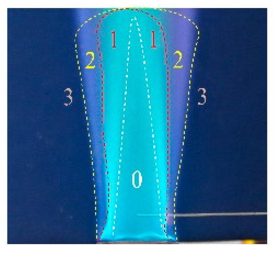 As for = 2–6 mm, the anode was out of the dead space and adequately in contact with the flame, and the cooling effects of cold gas and burner rim on the flame and anode were both weakened compared to = 1 mm. Therefore, and at = 2–6 mm were both higher, which resulted a smaller ; hence, a larger I. In addition, since the cooling effects were gradually weakened with , increased with ranging from 2 mm to 6 mm.