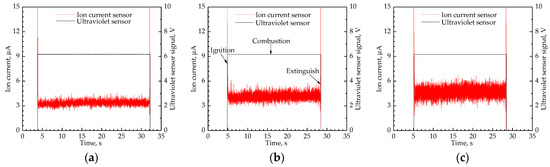 Ion current signals during flame monitoring: (a) = 50 L/h; (b) = 100 L/h; (c) = 150 L/h.