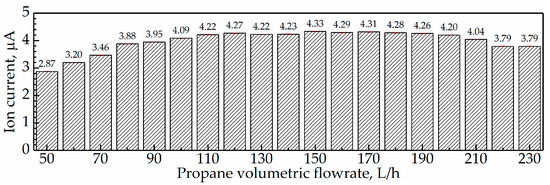 In addition, the average ion current during flame combustion under = 50–230 L/h were acquired, and the results are displayed in Figure 18. In this Figure, the average during combustion were all higher than 2 μA but lower than 5 μA.