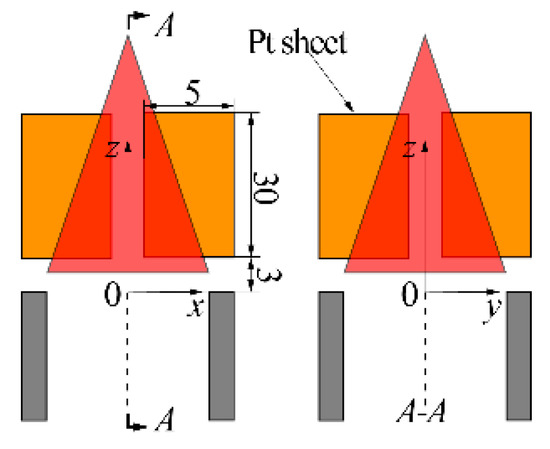 The expansion of that needs to add cathodes is a suitable measure to improve I in practical engineering. The specific structure proposed for expanding in this paper is shown in Figure 19. Four rectangular platinum sheets (5 mm × 30 mm × 0.1 mm) parallel to the radial direction of the burner exit were evenly arranged along the circumferential direction of the burner exit. The outer edges of the sheets and burner tube were aligned, which made the sheets contact adequately with the flame fronts under any circumstance. The lower edges of the sheets were 3 mm away from the tube exit, which ensures that the ignited flame could propagate continuously.
