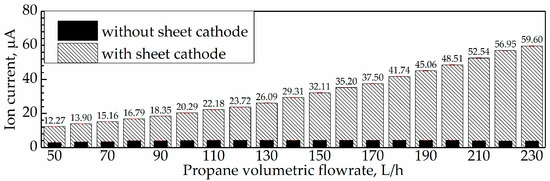 From Equation (14), provided that the electrodes are immersed into the flame, is mainly subjected to . The increasing of Sc can result in the reduction of and hence the rise of . Consequently, the ion current remained constant with the anode area but increased with the cathode area in the experiments, and expanding the cathode area that is in contact with the flame can greatly amplify the flame ion current.