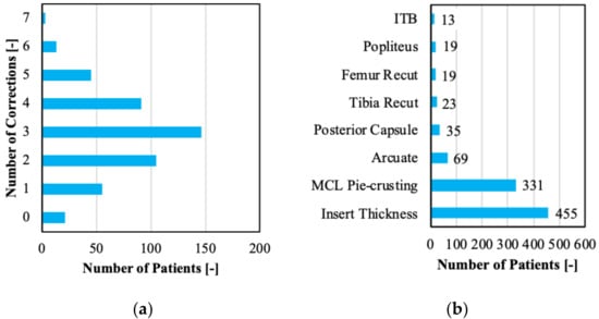 An average of 3.03 surgical corrections were required per patient to achieve a well-balanced and aligned knee. The number of corrections varied between zero corrections for some and up to seven corrections for other cases (Figure 2a). Focusing on the specific surgical corrections, pie-crusting the MCL and increasing the poly insert thickness were the most common interventions (Figure 2b).