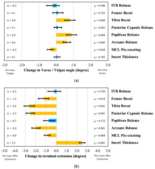 Evaluation of effect of various surgical decisions on (a) coronal (negative represents varus and positive represents valgus) and (b) sagittal alignment in extension (positive represents a decrease in terminal extension), with orange bars indicating statistically significant effects.