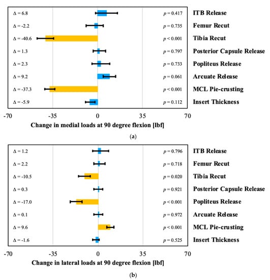 Evaluation of the effect of surgical correction on (a) medial (b) and lateral loads in 90 degrees of flexion, with orange bars indicating statistically significant effects. Each change is the post-correction value minus the pre-correction value.