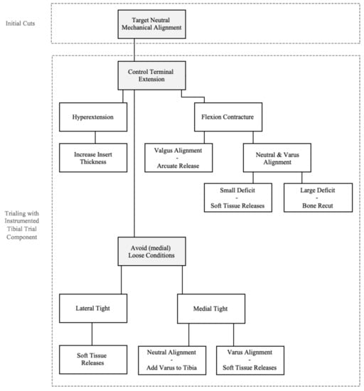 To balance a total knee, various surgical corrections can be performed depending on the alignment philosophy and balance targets. Since the introduction of intra-operative sensor technology, the latter has become quantifiable, whereas the former can be quantified intra-operatively using surgical navigation or robotics technology. In this paper, changes in the intra-articular loads and alignment parameters have been quantitatively assessed following various surgical corrections, thereby providing insight into the motivation for selecting various maneuvers. This results in a structured approach to achieve a quantitatively balanced knee that concurrently meets the surgeon’s defined alignment targets. This approach has schematically been presented in Figure 6.