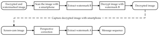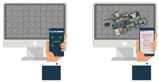 Figure 8 shows the extraction and decryption process. Nowadays, authentication and secret key management through smartphones are already mature technologies. When receiving the encrypted and watermarked image, authorized users can use smartphones to detect and extract watermark B by canning or photographing with a proprietary application. Then, the secret key and other information are obtained by decoding watermark B to decrypt the image.