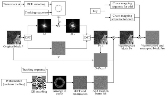 Figure 2 illustrates the embedding and encryption process of one block. If it is a multi-band image, we perform embedding and encryption on each band. The process can be divided into three parts. (1) Embed message A in the DFT domain. (2) Generate the watermark matrix of watermark B based on the QR code encoding method and inverse Fourier transform. Then, embed watermark B based on odd-even quantization and the difference caused by embedding message A. (3) Generate chaos mapping sequence for odd and even separately, and then perform encryption. Details are as follows:
