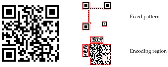 First, we encode watermark message sequence B by the QR code encoding method. The structure of the QR code includes the fixed pattern for resynchronization and encoding region for the message, as shown in Figure 3. Because we will rearrange the message bits, we do not need the fixed pattern. We choose the encoding region and record the encoding message line by line as . Considering the watermark capacity, the watermark message B is designed to be not more than 42 bytes of 8 bits [61]. The message is encoded by version 3 QR code with M error correction level, and it can be recorded as a sequence of bits.