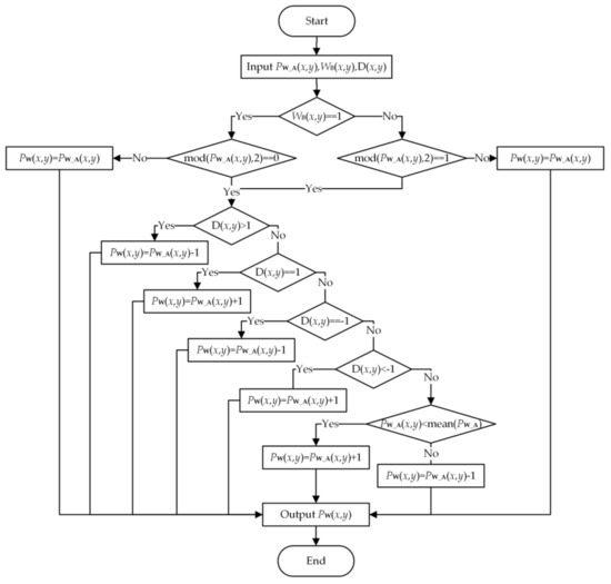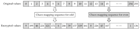 where defines the encrypted and watermarked image. An example of pixel encryption is shown in Figure 6, where all original even values are encrypted to low values and original odd values are encrypted to high values.