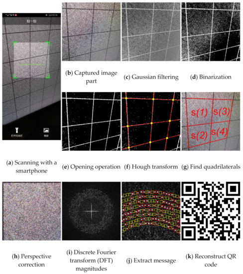 is then extracted also based on Equations (6) and (7). Based on the inverse process of the watermark generation method, the QR code is reconstructed with , as shown in Figure 9k. Finally, by decoding the QR code, the watermark message B containing the decryption key is obtained.