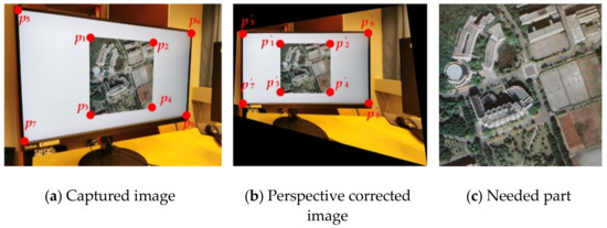 Using smartphones to extract watermark B from the encrypted image is like using smartphones to read QR code. Because today’s smartphones have high-megapixel cameras, the captured image will be highly zoomed-in compared with the original image displayed on the screen when shooting at a close distance. Therefore, for a screen-cam image scanned, as shown in Figure 9a, we zoom and crop out the needed part first. According to the camera resolution of the smartphone, we crop and zoom out the captured image accordingly to obtain image , as shown in Figure 9b. The perspective correction, message extraction and decryption process are as follows: