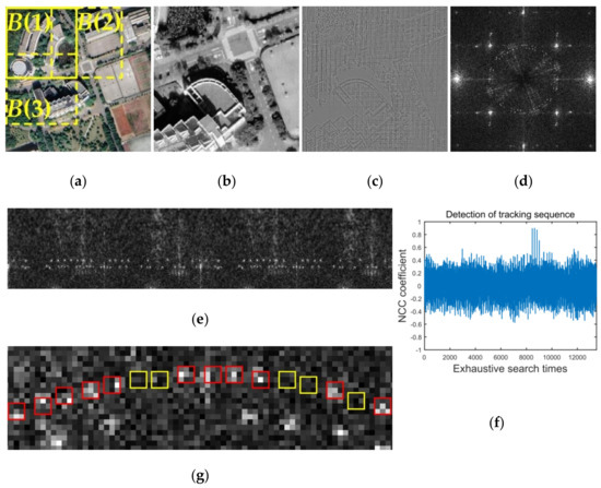 where defines the NCC coefficient of j-th search and defines the extracted message sequence of the j-th search. and defines the mean of extracted message sequence and the original tracking sequence. is the maximum coefficient value within the 3 × 3 region centered at the detection position. Because of this, if the watermark exists, more than one high NCC coefficient may be calculated. An example of calculation resulting from Figure 11e is shown in Figure 11f. If the maximum value of is greater than 0.65, which is an experimental threshold, we consider the positions of corresponding is the positions of embedded tracking sequence.