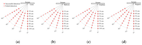 - Perspective transformation needs four pairs of points [43]. The side length is known, which means we know transformed coordinates of the four corners of one block. Therefore, we can select four corner points of one block for perspective correction. Select and construct into a point set , which contains all candidate point sets that can be used for perspective correction, based on the searching method in [44]. The are sorted according to the sum of the distances between the points from largest to smallest. An example of the quadrilaterals formed by each is shown in Figure 9g. The is selected for message extraction.