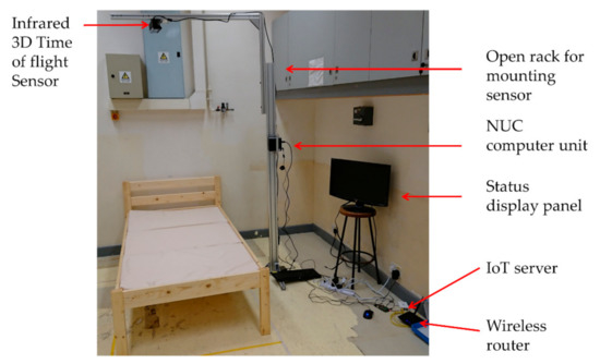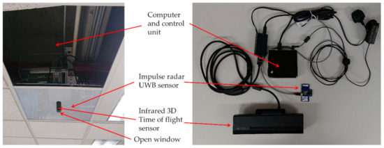 The system hardware was hidden in the suspended ceiling with a narrow window to allow emission and receiving of infrared light (Figure 1). As impulse radar signals can pass through the non-metallic obstacle without a decline in signal quality, no opening was created in the ceiling tile for it. Privacy and position were the prime factors to be contemplated in monitoring. The images captured by the 3D ToF sensor were a depth map, consisting of a two-dimensional array with a width of 512 pixels and a height of 424 pixels as the size, and the depth values as contents.
