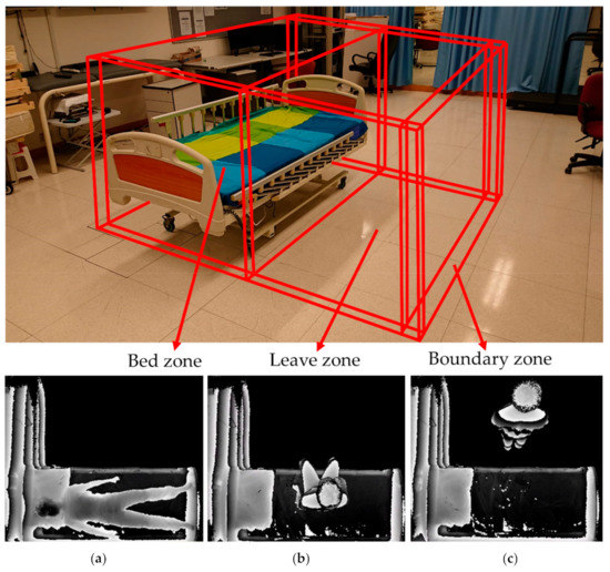 The algorithm used the decision tree approach with information from depth map and boundaries for classifying different positions and status. The status included sleeping, lying, sitting, standing, exiting, and others. There were different levels of alarm. As shown in Figure 3, a yellow alarm indicated that the subjects were located between the bed zone and the leaving zone which represented that the subjects sat on the edge of the bed or stood by the bed and may be going to exit the bed. A red alarm indicated the subjects departed the leave zone and crossed the boundary zone. The subjects totally leaving the zones could represent wandering or other potential risks. In this way, the activities near the bed (leave zone) would only give rise to the yellow (first level) alarm. Some statuses were used as internal statuses and thus not displayed.