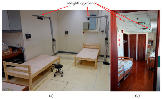 For the single-bed setting, the evaluation and the setup of the eNightLog system and the control were conducted simultaneously. An electric rehabilitation bed (length = 196 cm, width = 90 cm, height of bed surface = 55 cm) was positioned under the monitor zone of the eNightLog system. The sensors of eNightLog system was placed 270 cm above ground level (Figure 5). On the other hand, the pressure mat was placed on the bed where the subject was lying. The position of the pressure mat was checked and adjusted to the initial position in each trial. The infrared sensor was set up on the left side of the bed, where the subject could only enter or exit the bed in that direction. Two monitors were installed to display the status and changes corresponding to the eNightLog system and the conventional bed exiting detection system. In addition, a camcorder was set to record the subject’s activities and the monitor screens. An observer was to instruct the subject to perform activities predefined in a protocol. The observer also recorded the time when bed-exiting occurred by pressing the control button on a tablet.