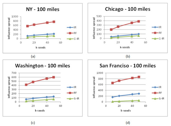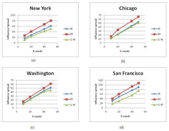 Figure 3 shows the influence spread within or out of target cities where locations lie under 150 miles of the target city on the Gowalla dataset. It can be seen that there is a huge difference in influence spread within and out of the target city achieved by RF, IR, and G-IR algorithms. Like in Figure 3a, when k = 20, the number of influenced users achieved by G-IR, IR, and RF algorithms are around 100, 180, and 650, respectively. There is a significant percentage difference in influence spread within and out of the target region. Similar difference is observed in other target cities as shown in Figure 3b–d. We conducted the same experiment on other cities of U.S., such as Seattle, California, Las Angles, and Los Vegas, and found the same influence spread difference in these target cities as well.