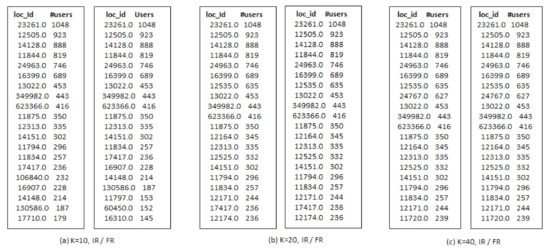 Figure 5 shows the top-k (k = 20) influential users selected by G-IR, IR and FR algorithms respectively. It is observed that each algorithm produce a different k-influential seed set, so it is better to select the seed set which could maximize the product promotion. Further, we discuss the influential locations selected by each algorithm.