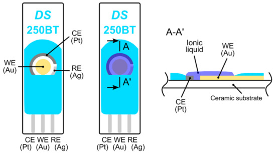 Fully-planar screen printed electrodes (250BT, DropSens); from the left: top view of the electrode topology, top view and cross section of the electrode topology with the ionic liquid layer.