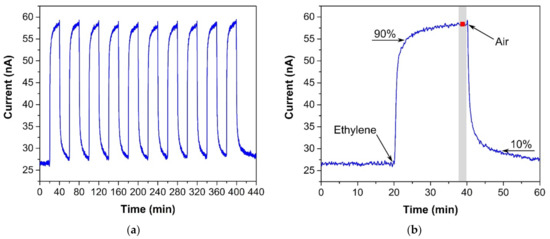 All experiments were carried out under constant and defined conditions, including temperature, relative humidity, pressure, and analyte flow rate, in order to eliminate parasitic effects of these quantities on sensor response. We experimentally tested the influence of relative humidity (RH) at zero ethylene concentration, when an increase from 30%RH to 50%RH resulted in a current increase of 15 nA, which roughly represents an equivalent increase in ethylene concentration of 13 ppm. This effect should be compensated when precise ethylene determination is required.