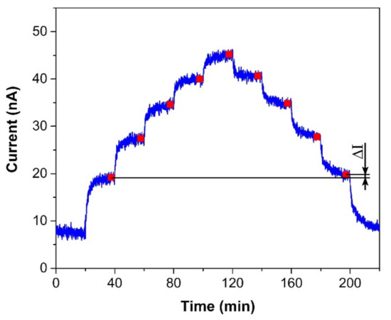 The sensor was exposed to several test cycles in order to determine basic sensor parameters such as sensitivity, response/recovery time, repeatability, hysteresis, limit of detection (LOD), and limit of quantification (LOQ). The first test cycle that the sensors were exposed to contained ten consecutive exposures to the same ethylene concentration (300 ppm, in our case). This test cycle provided information about the response/recovery time and repeatability of the sensor response. Figure 3a shows an example of the sensor response to a test cycle in which both exposures (to ethylene and air) alternated every 20 min. The response/recovery (T90/T10) time was defined as the time period which is necessary to achieve 90% or 10% of the full current change upon a step increase/decrease in ethylene concentration (see Figure 3b). Repeatability usually provides information about the short term stability of the sensor response. We defined it in terms of the relative standard deviation RSD (also known as the coefficient of variation) from ten consecutive exposures to the same concentration. The current value which represented each exposure was determined as follows. An average value of electric current (represented by the red square in Figure 3b) was calculated from the record for the last two minutes of the particular exposure to ethylene (grey region in Figure 3b). In this way, we obtained ten average values representing ten ethylene exposures, which served as input data for the calculation of the relative standard deviation. The second test was represented by a stepwise increase and subsequent decrease in ethylene concentration within the range 0–500 ppm (one step equaled 100 ppm). This test cycle provided data for determination of the sensitivity, LOD, and LOQ. Figure 4 shows an example of the sensor response to the test cycle where each concentration step of ethylene exposure lasted 20 min. The current value representing each concentration level was calculated as described above for the procedure determining repeatability. The red squares in Figure 4 represent average values that were calculated from the record for the last two minutes of exposure to a particular concentration level. Average values from the ascendant path were subsequently interpolated in order to obtain a calibration curve, the slope of which represented the sensor sensitivity. The sensitivity was also used to calculate the LOD and LOQ. The limit of detection was calculated as the ratio of the triple standard deviation of background current noise (at zero concentration) to sensitivity, the limit of quantification as the ratio of ten times the standard deviation of background current noise to sensitivity. Hysteresis was calculated as the difference between two current values (ΔI, see Figure 4) that were measured at the same ethylene concentration. The first value was obtained within the ascending path, the second within the descending path. The difference was subsequently expressed as a percentage of the maximum measured current (current response at the maximum ethylene concentration). The above-mentioned parameters of the tested sensors are summarized in Table 1. The first sensor was based on a fully-planar electrode topology with a layer of IL (marked as FP-250BT). The second sensor was based on a semi-planar electrode topology, where both the SPE layer and gold working electrode were prepared by screen printing (marked as SP-SCRP). The third sensor was based on a semi-planar topology where the solid polymer electrolyte layer and the gold working electrode were prepared by drop-casting and aerosol-jet printing, respectively (marked as SP-AJP). Before discussing the results in Table 1, it is necessary to remember one important fact. While the sensor with the fully planar topology (FP-250BT) had an Ag pseudoreference electrode, the new semi-planar topology contained a Pt pseudoreference electrode. This can naturally influence the actual level of the working electrode potential E and, therefore, comparisons of such sensors with different pseudoreference electrodes can be problematic or questionable. However, the fully-planar topology with the Pt pseudoreference electrode was also used by Zevenbergen et al. [34], and the cyclic voltammograms published in their study are almost identical to those published in this work. Thus, we believe that the comparison of such sensors is justifiable. We can say, therefore, that the commercial screen printed electrodes (FP-250BT) exhibited almost the same sensitivities and response times as those published by Zevenbergen et al. [34]; thus, we can use such parameters as default reference values. The higher detection limit achieved with the FP-250BT platform was primary because of the presence of greater background current noise.