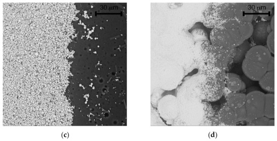 Significant progress was achieved with regard to sensor sensitivity. While the new semi-planar topology with the screen printed SPE layer and the gold working electrode (SP-SCRP) improved sensitivity only very slightly, the approach with the drop-cast SPE layer and the aerosol-jet printed working electrode (SP-AJP) resulted in more than ten times higher sensitivity. However, this result also indicated that the change in the topology itself (from fully-planar to semi-planar) did not improve the sensitivity. Thus, we focused in more detail on the SPE/WE interface, where the ethylene oxidation takes place. It should be noted that the new semi-planar topology allowed a unique insight into the morphology and microstructure of this electrochemical active interface. Figure 5a,b show both tested sensors with the semi-planar topology. First, we should mention some dimensions that were primarily determined by the different techniques of sensor preparation. The approximate thicknesses of the screen printed SPE layer and the gold WE were 10 and 15 µm, respectively. The approximate thicknesses of the drop-cast SPE layer and the aerosol-jet printed gold WE were 150 and 2.5 µm, respectively. Figure 5c,d show SEM images of the SPE/WE interface. The red ellipses in Figure 5a,b show areas that were captured by an electron microscope. These pictures indicate great differences in the morphology and microstructure of the SPE layers. While the printed layer (Figure 5c) exhibited minimum porosity with microscopic circular defects, the drop-cast SPE layer (Figure 5d) exhibited a highly porous structure. Spherical objects (so called spherulites) with diameters ranging from 10 to 50 µm were usually observed by the microscope. The morphology and microstructure of the SPE layer allowed these spherical objects to be almost completely surrounded by the gold layer, which resulted in an increase in the total electrochemically active area, and so in an increase in the sensor sensitivity. In order to exclude the influence of two different gold materials (polymer paste and nano-ink) on sensor sensitivity, we tested both paste and ink with the highly porous SPE microstructure presented in Figure 5d. Because we achieved almost the same results (regardless of the type of gold), we are convinced that the morphology and microstructure of the SPE layer had a crucial impact on the sensor sensitivity.
