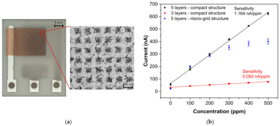 (a) Sensor with semi-planar topology and gold “micro-grid” electrode, (b) Calibration curves of sensors with semi-planar electrode topology and different gold working electrode structures (each point represents a mean value of 3 repeated exposures with corresponding 95% confidence interval). Conditions: 22 °C, 40%RH, 101.325 kPa, 1 L/min.