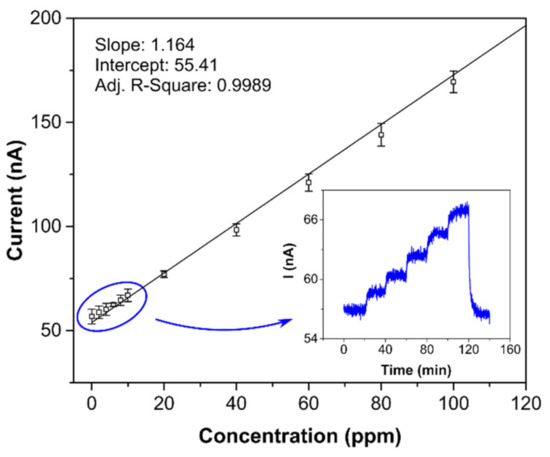 Calibration curve for the sensor with semi-planar topology and aerosol-jet printed compact Au electrode (5 layers); each point represents a mean value of 3 repeated exposures with corresponding 95% confidence interval; inset: current-time record within the range 0–10 ppm in steps of 2 ppm. Conditions: 22 °C, 40%RH, 101.325 kPa, 1 L/min.