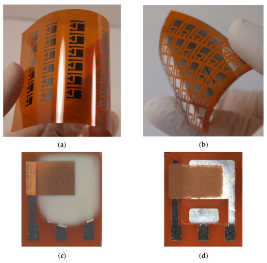The amperometric ethylene sensor with the semi-planar topology on the flexible Kapton substrate: (a) Platinum pattern of the pseudoreference (RE) and counter (CE) electrode printed by the AJP technique, (b) Platinum pattern of the RE and CE fabricated by “lift-off” technology, (c) The ethylene sensor with the drop-cast SPE layer and AJP-printed gold WE, (d) The ethylene sensor with the screen printed SPE layer and gold WE.