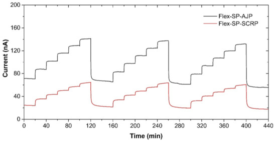 With manufacturing in mind, we also prepared the presented ethylene sensor with semi-planar electrode topology on a flexible substrate, substituting the original ceramic substrate with a sheet of Kapton substrate. This approach, where both electrodes and electrolyte can be processed using low-cost additive printing techniques, highlights the potential of polymer electrolytes with respect to the mass production of fully printed electrochemical gas sensors. The platinum counter and pseudoreference electrode were either printed by AJP technique (nanoparticle platinum ink Pt-LT-20, Fraunhofer IKTS, curing temperature 200 °C for 30 min) or prepared by “lift-off” technology (see Figure 8a,b). Subsequently, the SPE layers were deposited either by drop-casting or by screen printing (Figure 8c,d). The SPE compositions and thermal treatment conditions are described in Section 2.2. The gold working electrodes (WE) were printed either by AJP or screen printing (Figure 8c,d). The curing conditions for gold working electrodes are also described in Section 2.2. The sensors on flexible substrates were exposed to the test cycles described in Section 3 and resulting sensor parameters are summarized in Table 3. We can reasonably say that slight differences in the presented parameters between the flexible (Table 3) and rigid (Table 1; Table 2) platform can be attributed to the sample-to-sample variation during the preparation procedure. Figure 9 shows sensor response to repeated stepwise increase in ethylene concertation within the range 0–500 ppm (one step equals 100 ppm). This result demonstrates swift and reproducible sensor response within the tested range. While a slight drift of the background current at zero ethylene concentration can be attributed to the long “warm-up” time described in Section 3.5, different levels of the background current for both sensors is probably caused by different composition and properties of the polymer electrolyte layer.