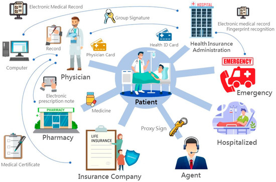 Shared Information between the medical office and health insurance companies: The information shared by the medical office (medical unit or doctor) and health insurance companies is the patient ID, diagnosis certificate, expense receipt. When a patient needs to apply for medical insurance from an insurance company, he/she only needs to ask the medical office to convert the contents of the diagnosis and treatment into the diagnosis certificate and expense receipt required for the insurance application and attach the doctor’s group private key signature to signify the doctor’s responsibility. Together with the patient’s public key certification, PCertP, it is encrypted with the public key of the insurance company designated by the patient and sent to the insurance company, which completes the transfer of information between the two units.