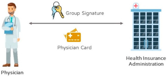 Regarding the protection of a doctor’s privacy, a doctor (DR) must apply for a doctor card and personal group signature secret key from the Bureau of National Health Insurance, and save the group signature secret key in the doctor card, as shown in Figure 3. In addition to the Bureau of National Health Insurance being able to know the doctor with the signature, anyone could simply utilize a group signature public key PKGK to verify the correctness and integrity, but not knowing the owner of the signature. It satisfies the characteristics of anonymity and privacy protection. Accordingly, a doctor with the identity IDD for the secret key SKD signature, the key certificate CertD is transmitted to the Bureau of National Health Insurance through a secure channel for applying for the group signature RD, as shown in Equation (3).