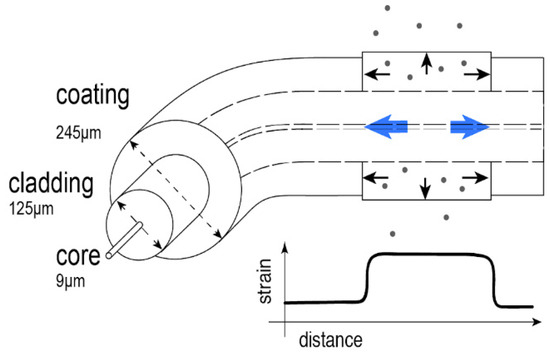 In the field of chemical sensing, optical fiber approaches have been investigated for many years [14]. Since silica optical fibers are chemically inert, fiber-optic based chemical sensing commonly requires converting the analyte information into changes of detectable quantities such as temperature or strain [14,15,16]. However, most of the chemical sensing approaches only probe substances at the end of the fiber or at few discrete locations, where the light is purposefully guided into a sensing element [15,16]. For distributed sensing, specialty fibers such as plastic or microstructured optical fibers are typically exploited [17,18], to allow for instance highly sensitive distributed gas sensing [19,20] or distributed humidity sensors [10]. Distributed gas sensing can be obtained by exploiting photothermal spectroscopy in microstructured fibers, in which the laser light is tuned on a gas molecular absorption line to increase the gas temperature, which is then measured by a distributed temperature sensing technique such as Rayleigh-based OTDR [19,20]. Using water-swellable polymers to coat silica fibers and reflectometry techniques, distributed humidity sensors have been reported [21]. In such a case, the mechanism behind distributed humidity sensing is based on the distributed measurements of the axial strain induced on the optical fiber by the expansion that experiences a hygroscopic fiber coating when exposed to water molecules [21]. Making use of other chemically sensitive swellable polymers, different chemical species can be detected by measuring the swelling-induced strain in the fiber. However, this approach has been mostly exploited for discrete point sensing, for instance, based on fiber Bragg gratings [22]. Only a few similar approaches have been reported for distributed sensing, being essentially used for distributed humidity sensing [8,9] and distributed pH sensing [23]. Recently, guided acoustic-wave Brillouin scattering has been explored for distributed sensing of external liquid analytes based on acoustic impedance mismatch in the interface between the optical fiber and the liquid solution [24,25,26].