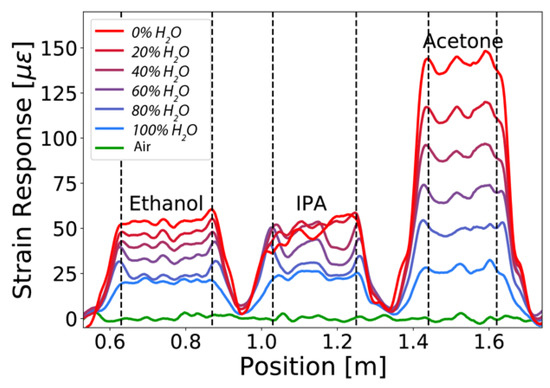 A generally monotonous increase of the induced strain is verified with increasing concentrations of ethanol, IPA, and acetone. The only exception is for the 100% IPA solution, for which a decrease of strain is observed between 1.0 m and 1.1 m. Partial dissolution of the polymer coating or eventual delamination from the cladding could explain this observation. This effect is not observed for ethanol and acetone even after a prolonged exposure during the experiment. While the overall strain for IPA and ethanol are comparable, the swelling strain for acetone is about three times higher. This is likely due to the aprotic nature of acetone, which makes it a better solvent for acrylic materials [32]. The same sensor response is observed when repeating the experiment under the same conditions, confirming that the sensor was not degrading in ethanol and acetone. The high spatial resolution of the sensor allows us to observe small strain variations along the immersed fiber sections. The average strain grows with increasing solvent concentration, and the amplitude in strain variation increases with higher concentrations. Thickness variations of the coating along the fiber are likely to be the origin of these variations and could be easily compensated by a local fiber response calibration.