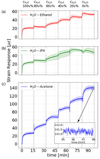 The inset of Figure 4 illustrates the measured strain over the last minutes of the experiment, where a flat strain response is obtained, and a standard deviation of 0.196 µε is verified. This value allows us to estimate the detection limit in terms of an actual percentual volumetric concentration that the sensor can detect. Detection limits of 0.59 v%, 0.49 v%, and 0.17 v% are verified for ethanol, IPA, and acetone, respectively.