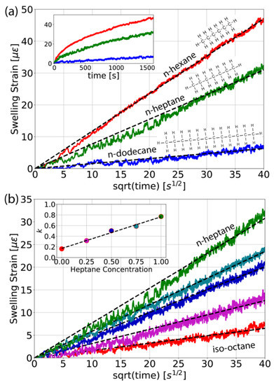 The ability of standard acrylate coated optical fibers to discriminate alkanes with different chain length, as well as blends thereof is also characterized. Alkanes are organic compounds that consist entirely of single-bonded carbon and hydrogen atoms without any other functional groups [36]. Alkane molecules with 5–17 carbon atoms are liquid at room temperature and key components found in gasoline. Figure 6a shows the temporal evolution of the longitudinally averaged swelling strain measured by the proposed sensing approach, for different concentrations of n-hexane (C6H14), n-heptane (C7H16), and n-dodecane (C12H26). Results indicate that shorter chain length alkane molecules result in stronger swelling effects. The length difference of only one carbon atom between n-heptane and n-hexane can easily be discerned. Penetration kinetics of solvents in polymethyl methacrylate can exhibit a variety of mechanisms [37]. The most common mechanism is a diffusion driven (Fickian) process. The inset in Figure 6a shows the swelling-induced strain as a function of time for three different chain length alkanes. Swelling kinetics in polymers can have complex dynamics with relaxation times that can be minutes to days. Here, even after 30 min the strain did not reach a steady state. A descriptive way to quantify diffusion kinetics is the power law X = k tm where X is the distance covered by the solvent front at time t, and k is a constant of the system and m the exponent, for Fickian kinetics m = 0.5 [38]. From the slope of the data plotted against the square root of time in Figure 6a, the constant k is estimated, which results in 1.18, 0.77, and 0.16 for n-hexane, n-heptane and n-dodecane, respectively. Results suggest that for the time frame of the measurements of 30 min the swelling mechanism is predominantly through a Fickian transport process. It is interesting to note that the first few seconds already provide the characteristic information regarding diffusion properties of the polymer-solvent pair. Figure 6b demonstrates that dilution of n-heptane in iso-octane linearly decreases the swelling strain with concentration. The inset shows that the resulting diffusion constants increase linearly for the five different concentrations measured.