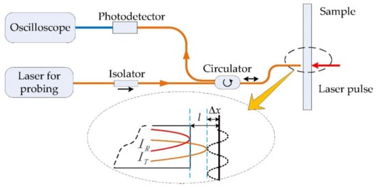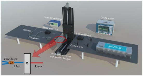 The experimental setup is schematically shown in Figure 2. In the experiments, a pulsed laser with a wavelength of 1064 nm and a duration of 6 ns was generated by an Nd:YAG laser (DAWA-200 from Beamtech Optronics Co., Ltd., Beijing, China), and the repetition rate of the laser source was selected as 3 Hz. The average laser pulse energy was controlled around 20 mJ to guarantee that the ultrasonic wave was generated. The splitter lens was used to divide the pulse laser into two beams. One beam of the laser was focused into a spotlight through a focus lens with a 100 mm focal length to excite the ultrasonic waves, and the other beam was received by a space photodetector (KG-PR-1G-A-PC from Beijing Conquer Optics Science & Technology Co., Ltd., Beijing, China) as the trigger signal to the digital oscilloscope (MOS-S-204A from Keysight Technologies, Inc., Santa Rosa, CA, USA). The position of the probe fiber and the pulsed laser relative to the sample is also depicted in the inset of Figure 2.