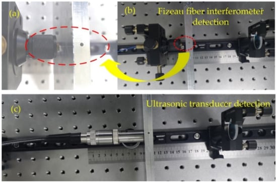 To illustrate the advantages of the proposed fiber interferometer, we compared our interferometer with the traditional ultrasonic devices. The fiber end face of the Fizeau fiber interferometer is presented in Figure 4a, which is the detailed enlarged view of the fiber probe in the actual picture of the detection as shown in Figure 4b. Figure 4c shows the detection by using an ultrasonic transducer with a center frequency of 1 MHz. The ultrasonic transceiver model of the ultrasonic probe is Olympus 5077PR.