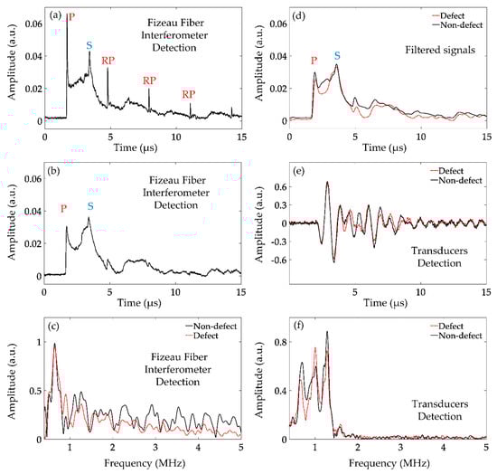 Detected time and frequency domain ultrasonic signals: Fizeau fiber interferometer signals without (a) and with (b) defects, as well as their frequency spectra (c) and the low-pass filtered signals (d). Signals (e) and their frequency spectra (f) detected by the ultrasonic transducers.