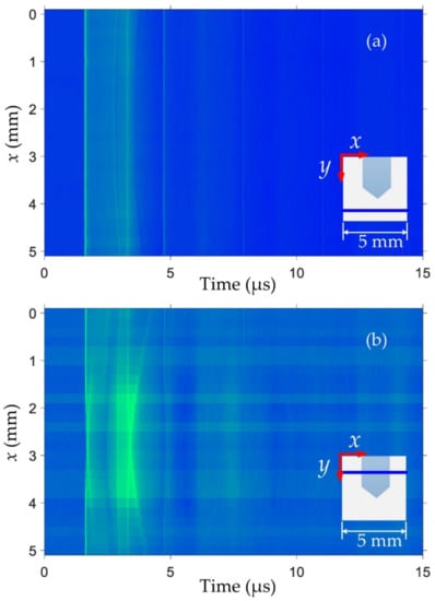 In order to further investigate the effects of internal defects on the transmission of ultrasonic waves, we selected the same horizontal scanning in the non-defective and defective regions and obtained the B scan images along the x-axis by data processing, shown respectively as Figure 6a,b. We have normalized the ultrasonic waveform by the P wave intensity without defects as the standard to facilitate the observation of the amplitude changes of ultrasonic waves. The intensity of the amplitude is represented by the color from blue to green: the greener the color, the greater the intensity of the signal. Referring to the ultrasonic mode analysis above, we can clearly observe the P wave and the S wave, and a series of boundary reflected waves in Figure 6a, when the scanning does not encounter any defects. Moreover, it has been proved that the amplitude intensity of recorded ultrasonic signals is very stable in the scanning process. In contrast, the ultrasonic waveform would change significantly when the interferometer was scanning in the defective region shown in Figure 6b. It can be seen that the amplitude of P waves will decrease as the scanning position gradually approaches the internal defect, while the amplitude of S waves increases due to the high-frequency damping phenomenon. Therefore, we have observed a bright region appearing around 3.3 μs as the scanning position moves to the location of the internal defect. As the scanning point moves out of the defective region, the ultrasonic waveform is restored to a non-defective state and remains stable again. In addition, we also found the arc-shaped ultrasonic from the diagram due to the cylindrical shape of the predrilled internal defect, indicating the possibility of defect shape identification based on the recorded ultrasonic signals by the interferometer.