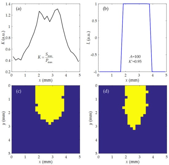 K (a) and L (b) parameters for the scanning signals along the x-axis and the C scan images of two samples with 2 mm (c) and 1.5 mm (d) diameter cylinders, where the yellow is for L = 1 and the blue is for L = −1.