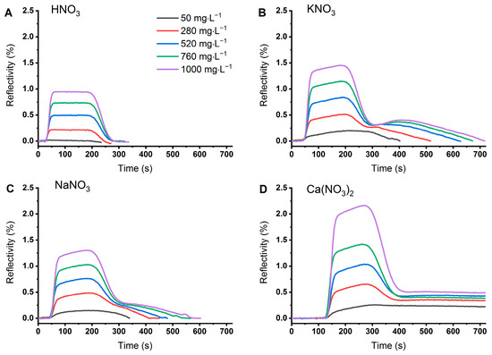 Surface plasmon resonance imaging (SPRi) signals of different forms of nitrates (HNO3 (A), KNO3 (B), NaNO3 (C), Ca(NO3)2 (D)) in water sensed by a biochip with unmodified gold surface.