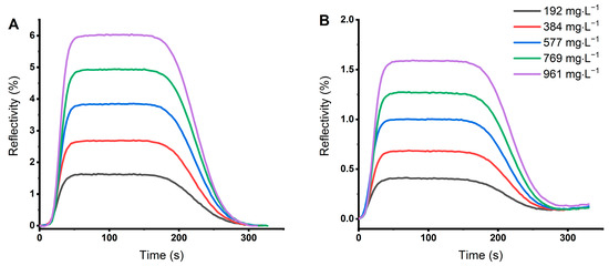 (A) SPRi signals of KNO3 dissolved in PBS buffer (pH 7.3) sensed on a monolayer of nitrate reductase and (B) SPRi signal of (NH₄)₂SO₄ dissolved in Tris buffer (pH 7.1) sensed on a monolayer of glutamine synthetase.