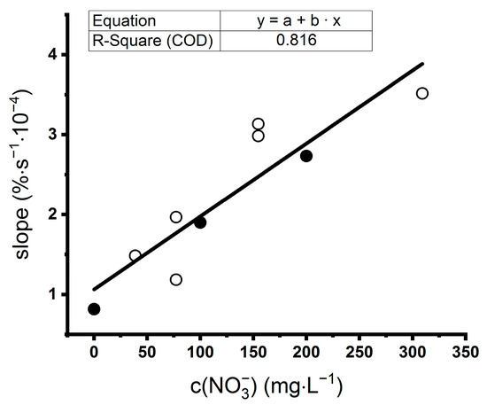 Detection of nitrate in Knop’s solution (white circles) used in hydroponics and a standard solution of KNO3 (black circles) on a monolayer of nitrate reductase (NR). KNO3 was dissolved in PBS buffer (pH 7.3), and the Knop’s solution was diluted by this PBS buffer ten times. A slope of the SPRi signal reflecting the interaction between nitrate and NR was calculated from recorded peaks of reflectivity. Linear regression was calculated from all points.