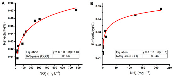 The relationship between SPRi signals measured by combined biosensors for the simultaneous detection of nitrate (A) and ammonia (B) and the concentration of ions in water samples from aquaponics measured by conventional methods. The sensor surface was modified by nitrate reductase (NO3− detection) and glutamine synthetase (NH4+ detection). The signal from the unmodified part of the sensor was used as a reference.