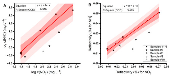 Six samples (1–6) were used to test the sensor, and another four samples (7–10) were used to verify results. We plotted ion concentrations (Figure 5) obtained from ion chromatography (NO3−) and spectrophotometry (NH4+) on a logarithmic scale. The first group of samples was fitted with the linear function, and the confidence and prediction intervals were calculated. From the second group of samples (Figure 5A, open symbols), three were outside the prediction interval with a relatively higher concentration of nitrate than ammonium ions compared to the rest of the samples (8–10).