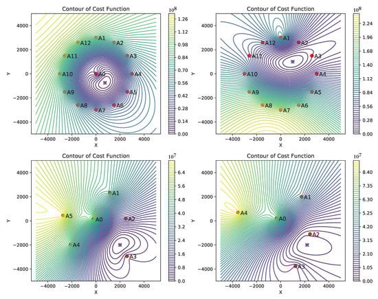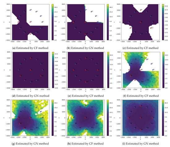 - In Figure 4, plots (a–e) show the localizable regions by the two methods without noise in measurements and plots (e–i) show the mean-L2-norm-error map with i.i.d. Gaussian noise in measurements. These plots clearly show that symmetric deployment of anchors is essential to have large localizable area in the ROI. Moreover, the GN method results into larger localizable area with lower location errors than the CF method for the same number of anchors taking part in measurements.