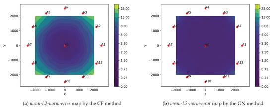 - In Figure 5, the plots show the mean-L2-norm-error map with i.i.d. Gaussian noise in and when the ROI is almost contained within the convex hull of the anchors. These assert that the GN method produces overall lower location errors than CF method.